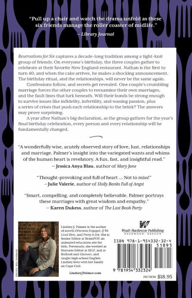 An entertaining and insightful pageturner about modern marriage and a tight-knit group of friends navigating their 30s and beyond. It's tradition that on everyone's birthday, the three couples gather to celebrate. They've toasted each other's big life milestones, and been there for each other through loss and disappointment, too. Nathan is the first to turn 40, and when the cake arrives, he makes a shocking announcement. The birthday ritual, and the group of friends, will never be the same again. Confessions follow, and secrets get revealed. One couple's crumbling marriage forces the other two couples to reexamine their own marriages, and the fault lines that lurk beneath. Will their bonds be strong enough to survive issues like infidelity, infertility, and waning passion, plus a series of crises that push each relationship to the brink? The answers may prove surprising. A year after Nathan's big declaration, as the group gathers for the year's final birthday celebration, every person and every relationship will be fundamentally changed. Perfect for fans of Emma Straub, J. Courtney Sullivan, and Rebecca Serle, Reservations for Six is a deeply satisfying novel full of wisdom, humor, and heart. It shines a spotlight on the phase of marriage when the fabric has started to fray, and deftly observes how couples cope, grow, and eventually thrive-together or apart.