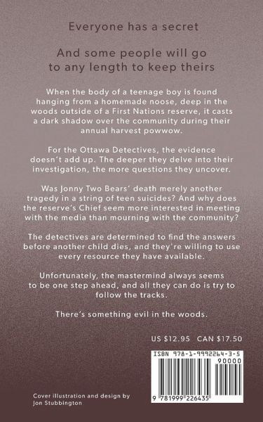 Everyone has a secret. And some people will go to any length to keep theirs. When the body of a teenage boy is found hanging from a homemade noose, deep in the woods outside of a First Nations reserve, it casts a dark shadow over the community during their annual harvest powwow. For the Ottawa Detectives, the evidence doesn’t add up. The deeper they delve into their investigation, the more questions they uncover. Was Jonny Two Bears’ death merely another tragedy in a string of teen suicides? And why does the reserve’s Chief seem more interested in meeting with the media than mourning with the community? The detectives are determined to find the answers before another child dies, and they're willing to use every resource they have available. Unfortunately, the mastermind always seems to be one step ahead, and all they can do is try to follow the tracks. There’s something evil in the woods.