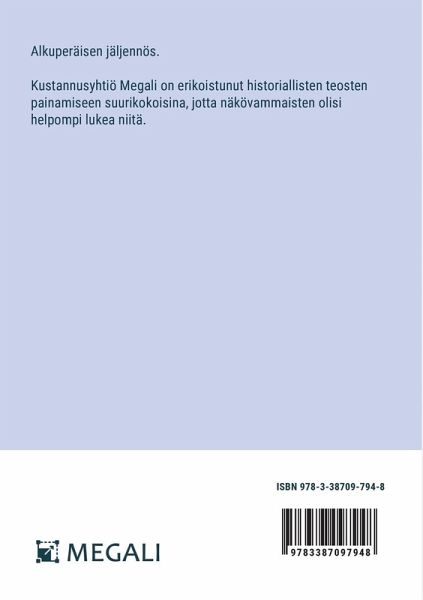 Alkuperäisen jäljennös. Kustannusyhtiö Megali on erikoistunut historiallisten teosten painamiseen suurikokoisina, jotta näkövammaisten olisi helpompi lukea niitä.