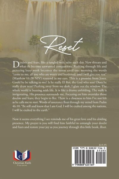 Doubts and fears, like a tangled web, seize each day. New threats and what-ifs become unwanted companions. Rushing through life and pursuing busy work becomes the norm until one morning the words "come to me, all you who are weary and burdened, and I will give you rest" (Matthew 11:28 NIV) resound in my ears. This is a promise from Jesus. Could he be talking to me? Is he really El Roi, the God who sees? Does he really draw near? Pushing away from my desk, I glare out the window. The whole world is buzzing with life. It is like a drama unfolding. The walk is invigorating. His presence surrounds me. Focusing on him overrides those doubts and fears; they begin to flee. There is a closeness to him I've not felt as he calls me to reset. Words of assurance float through my mind from Psalm 46:10: "Be still and know that I am God. I will be exalted among the nations, I will be exalted in the earth." Now it seems everything I see reminds me of his great love and his abiding presence. My prayer is you will find him faithful to untangle your doubt and fears and restore your joy as you journey through this little book, Reset.