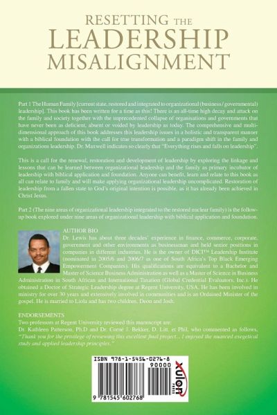 Part 1 The Human Family [current state, restored and integrated to organizational (business / governmental) leadership]. This book has been written for a time as this! There is an all-time high decay and attack on the family and society together with the unprecedented collapse of organisations and governments that have never been as deficient, absent or voided by leadership as today. The comprehensive and multi-dimensional approach of this book addresses this leadership issues in a holistic and transparent manner with a biblical foundation with the call for true transformation and a paradigm shift in the family and organizations leadership. Dr. Maxwell indicates so clearly that "Everything rises and falls on leadership". This is a call for the renewal, restoration and development of leadership by exploring the linkage and lessons that can be learned between organizational leadership and the family as primary incubator of leadership with biblical application and foundation. Anyone can benefit, learn and relate to this book as all can relate to family and will make applying organizational leadership uncomplicated. Restoration of leadership from a fallen state to God's original intention is possible, as it has already been achieved in Christ Jesus. Part 2 (The nine areas of organizational leadership integrated to the restored nuclear family) is the follow-up book explored under nine areas of organizational leadership with biblical application and foundation. ENDORSEMENTS Two professors at Regent University reviewed this manuscript are: Dr. Kathleen Patterson, Ph.D and Dr. Corné J. Bekker, D. Litt. et Phil, who commented as follows, "Thank you for the privilege of reviewing this excellent final project... I enjoyed the nuanced exegetical study and applied leadership principles." AUTHOR BIO Dr. Lewis has about three decades' experience in finance, commerce, corporate, government and other environments as businessman and held senior positions in companies in different industries. He is the owner of DICI(TM) Leadership Institute (nominated in 2005/6 and 2006/7 as one of South Africa's Top Black Emerging Empowerment Companies). His qualifications are equivalent to a Bachelor and Master of Science Business Administration as well as a Master of Science in Business Administration in South African and International Taxation (Global Credential Evaluators, Inc.). He obtained a Doctor of Strategic Leadership degree at Regent University, USA. He has been involved in ministry for over 30 years and extensively involved in communities and is an Ordained Minister of the gospel. He is married to Liola and has two children, Deon and Josh.