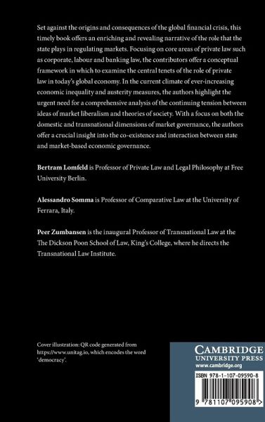 Set against the origins and consequences of the global financial crisis, this timely book offers an enriching and revealing narrative of the role that the state plays in regulating markets. Focusing on core areas of private law such as corporate, labour and banking law, the contributors offer a conceptual framework in which to examine the central tenets of the role of private law in today's global economy. In the current climate of ever increasing economic inequality and austerity measures, the authors highlight the urgent need for a comprehensive analysis of the continuing tension between ideas of market liberalism and theories of society. With a focus on both the domestic and transnational dimensions of market governance, the authors offer a crucial insight into the co-existence and interaction between state and market-based economic governance.