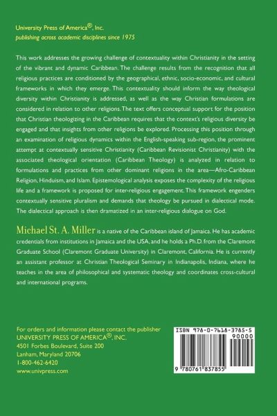 This work addresses the growing challenge of contextuality within Christianity in the setting of the vibrant and dynamic Caribbean. The challenge results from the recognition that all religious practices are conditioned by the geographical, ethnic, socio-economic, and cultural frameworks in which they emerge. This contextuality should inform the way theological diversity within Christianity is addressed, as well as the way Christian formulations are considered in relation to other religions. The text offers conceptual support for the position that Christian theologizing in the Caribbean requires that the context's religious diversity be engaged and that insights from other religions be explored. Processing this position through an examination of religious dynamics within the English-speaking sub-region, the prominent attempt at contextually sensitive Christianity (Caribbean Revisionist Christianity) with the associated theological orientation (Caribbean Theology) is analyzed in relation to formulations and practices from other dominant religions in the area-Afro-Caribbean Religion, Hinduism, and Islam. Epistemological analysis exposes the complexity of the religious life and a framework is proposed for inter-religious engagement. This framework engenders contextually sensitive pluralism and demands that theology be pursued in dialectical mode. The dialectical approach is then dramatized in an inter-religious dialogue on God.