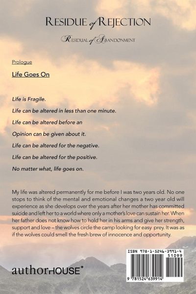 Residue of Rejection Residual of Abandonment Prologue Life Goes On Life is Fragile. Life can be altered in less than one minute. Life can be altered before an Opinion can be given about it. Life can be altered for the negative. Life can be altered for the positive. No matter what, life goes on. My life was altered permanently for me before I was two years old. No one stops to think of the mental and emotional changes a two year old will experience as she develops over the years after her mother has committed suicide and left her to a world where only a mother's love can sustain her. When her father does not know how to hold her in his arms and give her strength, support and love - the wolves circle the camp looking for easy prey. It was as if the wolves could smell the fresh brew of innocence and opportunity.