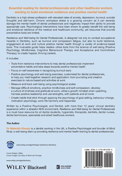 Resilience and Well-being for Dental Professionals, is designed not only to combat occupational hazards in Dentistry, such as burnout and compassion fatigue, but also to build resilience, engagement at work and nurture positive mental health through a variety of evidence-based tools. This invaluable guide helps readers utilise tools from the science of well-being (Positive Psychology, Mindfulness, Cognitive Behavioural Therapy and Acceptance and Commitment Therapy), to create happier, thriving careers.