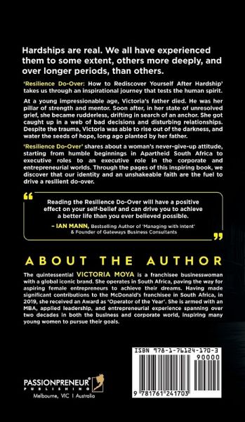 'Hardships are real. We all have experienced them to some extent, others more deeply, and over longer periods, than others.' 'Resilience Do-Over: How to Rediscover yourself After Hardship' takes us through an inspirational journey that tests the human spirit. At a young impressionable age, Victoria's father died. He was her pillar of strength and mentor. Soon after, in her state of unresolved grief, she became rudderless, drifting in search of an anchor. But she got caught up in a web of bad decisions and disturbing relationships. Despite the trauma, Victoria was able to rise out of the darkness, and water the seeds of hope, long ago planted by her father. 'Resilience Do-Over' shares about a woman's never-give-up attitude, starting from humble beginnings in Apartheid South Africa to executive roles in the corporate, and entrepreneurial worlds. Through the pages of this inspiring book, we discover that your identity and an unshakeable faith is the fuel to drive a resilient do-over. About the author: The quintessential Victoria Moya is a franchisee businesswoman with a global iconic brand. She operates in South Africa, paving the way for aspiring female entrepreneurs to achieve their dreams. Having made significant contributions to the McDonald's franchise in South Africa, in 2019, she received an Award as 'Operator of the Year'. She is armed with an MBA, applied leadership and entrepreneurial experience spanning over two decades in the business and the corporate world, inspiring many young women to pursue their goals.