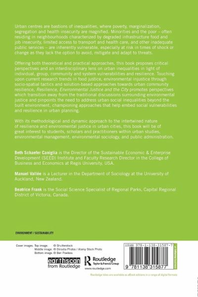 Urban centres are bastions of inequalities, where poverty, marginalization, segregation and health insecurity are magnified. Minorities and the poor - often residing in neighbourhoods characterized by degraded infrastructures, food and job insecurity, limited access to transport and health care, and other inadequate public services - are inherently vulnerable, especially at risk in times of shock or change as they lack the option to avoid, mitigate and adapt to threats. Offering both theoretical and practical approaches, this book proposes critical perspectives and an interdisciplinary lens on urban inequalities in light of individual, group, community and system vulnerabilities and resilience. Touching upon current research trends in food justice, environmental injustice through socio-spatial tactics and solution-based approaches towards urban community resilience, Resilience, Environmental Justice and the City promotes perspectives which transition away from the traditional discussions surrounding environmental justice and pinpoints the need to address urban social inequalities beyond the build environment, championing approaches that help embed social vulnerabilities and resilience in urban planning. With its methodological and dynamic approach to the intertwined nature of resilience and environmental justice in urban cities, this book will be of great interest to students, scholars and practitioners within urban studies, environmental management, environmental sociology and public administration.