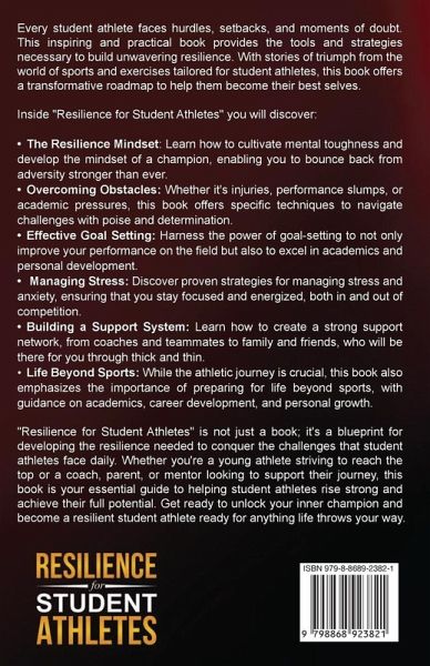 Turning Setbacks into Comebacks In the world of sports, success is often measured not only by the medals and trophies won but by the life lessons learned along the way. "Resilience for Student Athletes" by S.R. DUBRISH is an inspirational self-discipline book that serves as a guiding light for both athletes and those who support them-coaches, teachers, and parents-on the path to success not only in sports but in life itself. This self-help book dives into the core principles of the game and beyond, emphasizing values such as time management, discipline, and resilience above all. Within these pages, you will find stories of triumph and adversity, shedding light on the true meaning of sportsmanship, teamwork, and perseverance. The profound wisdom shared within the chapters of this self-development and coaching book will empower the next generation to conquer challenges both on and off the playing field, to strike a harmonious balance between athletic pursuits and academic excellence, and ultimately, to lead lives enriched with valuable life lessons. Through a thoroughly motivational journey, the world of sports transforms into a classroom for character development, where champions are not just defined by their wins, but by the quality of their character. Contents Worth Their Weight in Gold With advice that does not just create ripples, but a tidal wave of change, "Resilience for Student Athletes" has all the qualities of a potent leadership book. It is the secret sauce in the recipe of dreams! ¿¿¿¿ Management: This transformative sports book imparts time management skills, striking a perfect balance between sports and academics. ¿¿¿¿ Intelligence: It equips readers with mental strategies used by elite athletes, fostering resilience and grit. ¿¿¿¿ Resilience: Readers learn effective injury prevention and rehabilitation techniques, ensuring a comeback that's stronger than ever. ¿¿¿¿ Balance: The self-improvement book provides practical tips for excelling academically while pursuing athletic dreams. ¿¿¿¿ Bonding: It guides in cultivating strong relationships with coaches, teammates, and mentors. ¿¿¿¿ Achievement: Readers set and achieve ambitious yet attainable goals. ¿¿¿¿ And Life! A productivity book fueling the development of the youth athlete and preparing for life after athletics, offering career insights, networking, and future planning. A Companion for Champions "Resilience for Student Athletes" is the ultimate gift for any budding sports star. It is a turbocharger for their passions and the golden ticket for their aspirations - plus a coach, parent, and teacher must-have! Gift your rising stars something that will not gather dust on the shelf - this literary gem that will keep on giving.