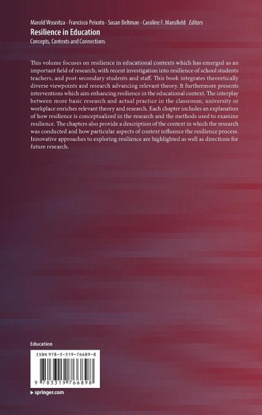 This volume focuses on resilience in educational contexts which has emerged as an important field of research, with recent investigation into resilience of school students teachers, and post-secondary students and staff. The book integrates theoretically diverse viewpoints and research advancing relevant theory. It furthermore presents interventions which aim enhancing resilience in the educational context. The interplay between more basic research and actual practice in the classroom, university or workplace enriches relevant theory and research. Each chapter includes an explanation of how resilience is conceptualized in the research and the methods used to examine resilience. The chapters also provide a description of the context in which the research was conducted and how particular aspects of context influence the resilience process. Innovative approaches to exploring resilience are highlighted as well as directions for future research.