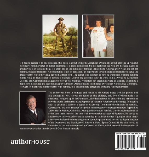 If I had to reduce it to one sentence, this book is about living the American Dream. It's about growing up without electricity, running water or indoor plumbing. It's about being poor, but not realizing that you are, because everyone around you is in the same boat. It's about one of the millions of families that come to America every year, and ask for nothing, but an opportunity. An opportunity to get an education, an opportunity to work and an opportunity to serve the great country which they have adopted as their own. The author tells the story of how he went from working fulltime nights while in high school to earning a Masters' Degree. He describes how he went from a Private to Lieutenant Colonel, and Commanding a Squadron of over 400 Marines. Went from not speaking a word of English, to holding a Top Secret Clearance and becoming Deputy Director, Operations and Intelligence Division at Naval Space Command. He went from arriving in this country with nothing, to a solid military career and living the American Dream.