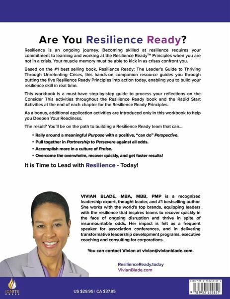 Are You Resilience Ready? Resilience is an ongoing journey. Becoming skilled at resilience requires your commitment to learning and working at the Resilience Ready Principles when you are not in a crisis. Your muscle memory must be able to kick in as crises confront you. Based on the #1 best-selling book, Resilience Ready: The Leader's Guide to Thriving Through Unrelenting Crises, this hands-on companion resource guides you through putting the five Resilience Ready Principles into action today, enabling you to build your resilience skill in real time. This workbook is a must-have step-by-step guide to process your reflections on the Consider This activities throughout the Resilience Ready book and the Rapid Start Activities at the end of each chapter for the Resilience Ready Principles. As a bonus, additional application activities are introduced only in this workbook to help you Deepen Your Readiness. The result? You'll be on the path to building a Resilience Ready team that can... o Rally around a meaningful Purpose with a positive, "can do" Perspective. o Pull together in Partnership to Persevere against all odds. o Accomplish more in a culture of Praise. o Overcome the overwhelm, recover quickly, and get faster results! It is Time to Lead with Resilience - Today!