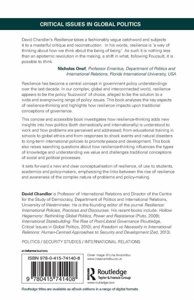 Resilience has become a central concept in government policy understandings over the last decade. In our complex, global and interconnected world, resilience appears to be the policy 'buzzword' of choice, alleged to be¿the solution to a wide and ever-growing range of policy issues. This book analyses the key aspects of resilience-thinking and highlights how resilience impacts upon traditional conceptions of governance. This concise and accessible book investigates how resilience-thinking adds new insights into how politics (both domestically and internationally) is understood to work and how problems are perceived and addressed; from¿educational training in schools to global ethics and from responses to shock events and natural disasters to long-term international policies to promote peace and development. This book also raises searching questions¿about how resilience-thinking influences the types of knowledge and understanding we value and challenges traditional conceptions of social and political processes. It sets forward a new and clear conceptualisation of resilience, of use to students, academics and policy-makers, emphasising the links between the rise of resilience and awareness of the complex nature of problems and¿policy-making.