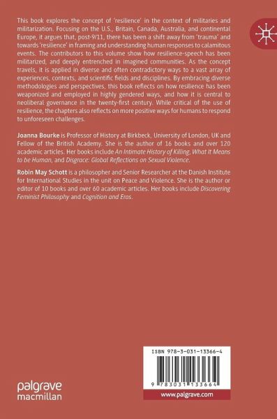 This book explores the concept of 'resilience' in the context of militaries and militarization. Focusing on the U.S., Britain, Canada, Australia, and continental Europe, it argues that, post-9/11, there has been a shift away from 'trauma' and towards 'resilience' in framing and understanding human responses to calamitous events. The contributors to this volume show how resilience-speech has been militarized, and deeply entrenched in imagined communities. As the concept travels, it is applied in diverse and often contradictory ways to a vast array of experiences, contexts, and scientific fields and disciplines. By embracing diverse methodologies and perspectives, this book reflects on how resilience has been weaponized and employed in highly gendered ways, and how it is central to neoliberal governance in the twenty-first century. While critical of the use of resilience, the chapters also reflect on more positive ways for humans to respond to unforeseen challenges.