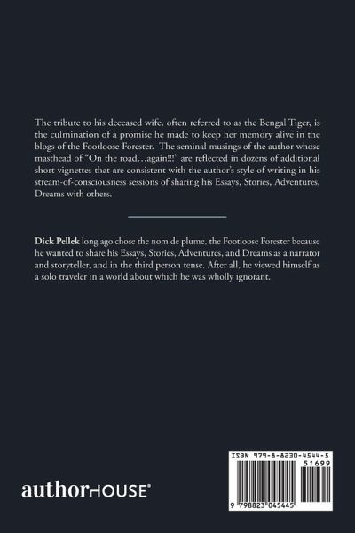 The tribute to his deceased wife, often referred to as the Bengal Tiger, is the culmination of a promise he made to keep her memory alive in the blogs of the Footloose Forester. The seminal musings of the author whose masthead of "On the road...again!!!" are reflected in dozens of additional short vignettes that are consistent with the author's style of writing in his stream-of-consciousness sessions of sharing his Essays, Stories, Adventures, Dreams with others.