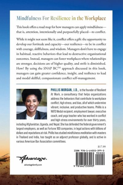 Mindfulness For Resilience in the Workplace This book offers a roadmap for how managers can apply mindfulness- that is, attention, intentionally and purposefully placed-to conflict. While it might not seem like it, conflict offers a gift: the opportunity to develop our fortitude and capacity-our resilience-to be in conflict with courage, skillfulness, and wisdom. Managers don't have to engage in habitual, reactive behaviors that lead to destructive organizational outcomes. Instead, managers can foster workplaces where relationships are stronger, decisions are of higher quality, and strife is diminished. How? By using the SNAP BC TM approach discussed in this book, managers can gain greater confidence, insight, and resilience to lead and model skillful, compassionate conflict self-management.