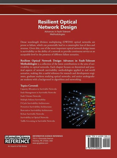 Dense wavelength division multiplexing (DWDM) optical networks are prone to failure, which can potentially lead to a catastrophic loss of data and revenue. Given this, one of the most important optical network design issues is survivability or the ability of a network to provide continuous service at an acceptable level in the presence of different failure scenarios. Resilient Optical Network Design: Advances in Fault-Tolerant Methodologies is a collection of the latest contributions to the area of survivability in optical networks. Each chapter focuses on theoretical and practical aspects of network survivability methodologies applied to real world scenarios, making this a useful reference for research and development engineers, graduate students studying optical networks, and senior undergraduate students with a background in algorithms and networking.