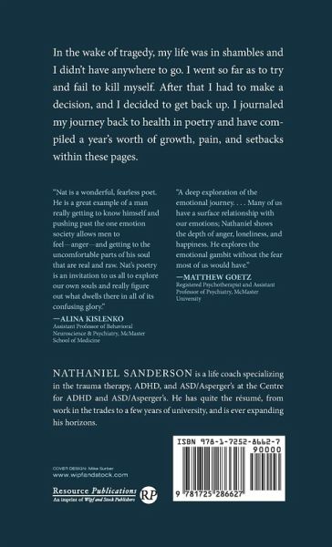 In the wake of tragedy, my life was in shambles and I didn't have anywhere to go. I went so far as to try and fail to kill myself. After that I had to make a decision, and I decided to get back up. I journaled my journey back to health in poetry and have compiled a year's worth of growth, pain, and setbacks within these pages.