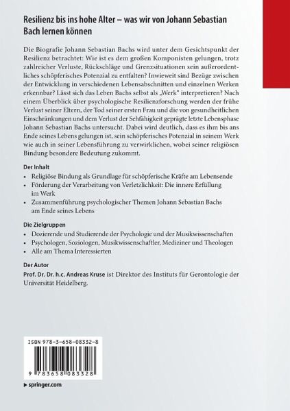 Die Biografie Johann Sebastian Bachs wird unter dem Gesichtspunkt der Resilienz betrachtet: Wie ist es dem großen Komponisten gelungen, trotz zahlreicher Verluste, Rückschläge und Grenzsituationen sein außerordentliches schöpferisches Potenzial zu entfalten? Inwieweit sind Bezüge zwischen der Entwicklung in verschiedenen Lebensabschnitten und einzelnen Werken erkennbar? Lässt sich das Leben Bachs selbst als "Werk" interpretieren? Nach einem Überblick über psychologische Resilienzforschung werden der frühe Verlust seiner Eltern, der Tod seiner ersten Frau und die von gesundheitlichen Einschränkungen und dem Verlust der Sehfähigkeit geprägte letzte Lebensphase Johann Sebastian Bachs untersucht. Dabei wird deutlich, dass es ihm bis ans Ende seines Lebens gelungen ist, sein schöpferisches Potenzial in seinem Werk wie auch in seiner Lebensführung zu verwirklichen, wobei seiner religiösen Bindung besondere Bedeutung zukommt.