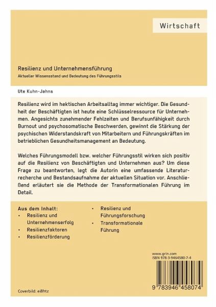 Diese Werk gibt einen Literaturüberblick zum aktuellen Wissensstand über Resilienz und Unternehmensführung. Auf der Basis einer Literaturrecherche wird die Frage beantwortet, für welches Führungsmodell bzw. welchen Führungsstil sich Wirkungen auf die Resilienz von Beschäftigten und Unternehmen belegen lassen.Die organisationale Resilienz eines Unternehmens ist nicht von der personalen Resilienz der Beschäftigten zu trennen. Sie beruht auf dem Zusammenspiel von Organisationsstrukturen, Arbeitsbedingungen, persönlichen Merkmalen und Kompe-tenzen der Mitarbeiter und Führungskräfte und auf deren Interaktionen. Die Gesundheit der Beschäftigten gilt heute als eine Schlüsselressource für Unter-nehmen. Angesichts zunehmender Fehlzeiten und Berufsunfähigkeit durch Burnout und psychosomatische Beschwerden gewinnt die Stärkung der psychischen Wider-standskraft von Mitarbeitern und Führungskräften im betrieblichen Gesundheitsma-nagement an Beachtung. Die Literatur belegt die besondere Bedeutung eines transformationalen Führungsstils für die Resilienz von Mitarbeitern. Transformational agierende Führungskräfte werden im Vergleich zu jenen, die eher transaktionale oder laissez-faire-Führung praktizieren, als weniger Stress auslösend wahrgenommen. Transformational geführte Mitarbeiter fühlen sich wohler am Arbeitsplatz, sind seltener krank und zufriedener mit ihrer Arbeitsaufgabe - sie gelten als resilienter. Die Transformation der Geführten erfolgt über die Vorbildfunktion der Führungskraft, die sich an psychischen Grundbedürfnissen der Mitarbeiter orientiert, gemeinsame Werte vermittelt und soziale Unterstützung anbietet. Transformationale Führung erscheint gerade in Zeiten rascher Umbrüche und wirtschaftlicher Krisen als vorteilhaft für Unternehmen: sie unterstützt die Aufgeschlossenheit der Mitarbeiter gegenüber Veränderungen, entwirft ein optimistisches Zukunftsbild, erklärt den Veränderungsbedarf und regt neue Lösungsansätze an. Mitarbeiter und Führungskräfte resilienter Organisationen verfügen über vergleichsweise höhere Flexibilität, Adaptabilität und Leistungsbereitschaft.