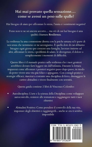 Hai mai provato quella sensazione... come se avessi un peso sulle spalle? Hai bisogno di aiuto per affrontare lo stress, l'ansia e i sentimenti negativi? Forse non te ne sei ancora accorto... ma ciò di cui hai bisogno è una qualità chiamata Resilienza. La resilienza ha una connessione diretta con la psiche umana ed è parte di noi senza che nemmeno ce ne accorgiamo. È quella dote di cui abbiamo bisogno ogni giorno per crescere una famiglia, lavorare insieme ad altri, affrontare lo stress, i problemi di salute, le divergenze, il dolore o semplicemente i momenti di difficoltà. Questo libro è il manuale pratico sulla resilienza che i tuoi genitori avrebbero dovuto farti leggere sin dall'infanzia. Durante la lettura imparerai come affrontare i pensieri negativi passo dopo passo, in modo da poter vivere una vita più felice e appagante. Con consigli pratici e strategie efficaci, riuscirai a costruire una disciplina di ferro, distruggere le cattive abitudini e vivere finalmente con serenità. Questa guida contiene 2 libri di Vincenzo Colombo: Autodisciplina: L'arte e la scienza della Disciplina: come sviluppare autocontrollo, resistere alle tentazioni e raggiungere tutti i tuoi obiettivi Abitudini Positive: Come prendere il controllo della tua vita, impostare degli obiettivi e raggiungerli... anche se ora ti sembra impossibile Ecco un assaggio di ciò che scoprirai all'interno: Che cos'è la resilienza... e perchè tutti ne parlano? Come scoprire i tuoi punti di forza Come costruire una disciplina d'acciaio, anche se ti consideri un "procrastinatore" Come eliminare le cattive abitudini dalla tua vita Come annientare le energie negative che portano a insonnia, esaurimento e affaticamento surrenale Come far funzionare esattamente le tue emozioni per te, e non contro di te! (questo è davvero importante) Come affrontare le sfide quotidiane nel modo giusto e superarle con facilità E molto altro ancora! Questo libro ti offrirà gli strumenti per affrontare le sfide della vita con meno ansia, più ottimismo, autostima, calma e concentrazione. Non perdere tempo e segui i consigli di questo manuale, ti renderai subito conto dei cambiamenti positivi nella tua vita. Clicca sul pulsante arancione "Acquista adesso con 1 Click" per iniziare a leggere questo libro!