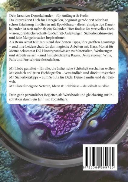 Dein kreativer Dauerkalender - für Anfänger & Profis Du interessierst Dich für Harzgießen, beginnst gerade erst oder hast schon Erfahrung im Gießen mit Epoxidharz - dieser einzigartige Dauerkalender ist weit mehr als ein Kalender. Hier findest Du wertvolles Fachwissen, praktische Schritt-für-Schritt-Anleitungen, Sicherheitshinweise und jede Menge kreative Inspirationen.Als Resin Artist teilt Bibi Rend ihre besten Tipps, ihre größten Learnings - und ihre Leidenschaft für das magische Arbeiten mit Harz. Monat für Monat bekommst DU Hintergrundwissen zu Materialien, Werkzeugen und Arbeitsweisen - und hast gleichzeitig Raum, Deine eigenen Wins, Fails und Fortschritte festzuhalten.Mit Liebe gestaltet - für alle, die ästhetische Schönheit erschaffen wollen.Mit einfach erklärten Fachbegriffen - verständlich und direkt umsetzbar. Mit Sicherheitstipps - zum Schutz für Dich, Deine Familie und der Umwelt.Mit Platz für eigene Notizen, Ideen & Erlebnisse - dauerhaft nutzbar.Dein ganz persönlicher Begleiter, als Workbook und gleichzeitig zur Inspiration durch ein Jahr mit Epoxidharz.