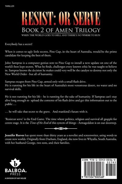 Everybody has a secret! When it comes to ugly little secrets, Pine Gap, in the heart of Australia, would be the prime candidate for keeping the best of them. John Sampras is a computer genius sent to Pine Gap to install a new update on one of the world's best kept secrets. What he finds, challenges every known ethic he was taught to believe in. Sampras knows the decision he makes could very well be the catalyst to destroy not only the New World Order - but all of humanity. Sampras escapes from Pine Gap, armed only with a small flash drive. He is running for his life in the heart of Australia's most venomous desert, no water and no survival skills. He is not running for his life - he is running for the sake of humanity. If Sampras can't stay alive long enough to upload the contents of his flash drive and get this information out to the public ... ... he will take that secret to the grave. And mankind's future with it. 'Resist:or serve' is the End Game. The time where politics, religion and survival all grapple for centre stage. It is the Time of the End of this system of things - Armageddon is on our doorstep.