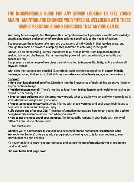 The Indispensable Guide for Any Senior Looking To Feel Young Again! - Maintain and Enhance Your Physical Wellbeing With These Simple Resistance Band Exercises That Anyone Can Do Written by fitness expert, Baz Thompson, this comprehensive book presents a wealth of knowledge, practical guidance, and an array of exercises tailored specifically to the needs of seniors. Baz recognizes the unique challenges and aspirations of individuals in their golden years, and through this book, he provides a step-by-step roadmap to achieving these goals. Embark on an empowering journey that caters to all fitness levels, from beginners to those seeking advanced challenges. By harnessing the power of resistance bands, a versatile and accessible tool, Baz presents a wide range of exercises carefully crafted to improve flexibility, agility, and overall physical fitness. With clear instructions and detailed illustrations, each exercise is explained in a user-friendly manner, ensuring that seniors of all abilities can safely and effectively engage in the workouts. In this informative and practical book, you'll discover: * More than just physical benefits: Dive right into the importance of maintaining an active lifestyle as you continue to age. * Positive impacts overall: There's nothing to lose! From feeling happier and healthier to having an overall better quality of life. * Step-by-step guidance with pictures: Know exactly what to do, how to do, and why you're doing it with informative images and guidelines. * Proper techniques to stay safe: Avoid injuries with these warm-up and cool-down techniques to help lock in the burn and keep you spry. * Life doesn't end after your 20s: These transformative routines are here to get you on the path to being healthier and more active than when you were 20. * How to get the most out of your workout: Aim for specific regions in your body with plenty of different exercises to choose from! And so much more! Whether you're a newcomer to exercise or a seasoned fitness enthusiast, the book offers a gradual progression, allowing you to tailor your routine to your individual needs and abilities. So, what are you waiting for? Take the necessary steps to improve your health and feel young again with "Resistance Band Workouts for Seniors". Scroll up and Get Your Copy Now!