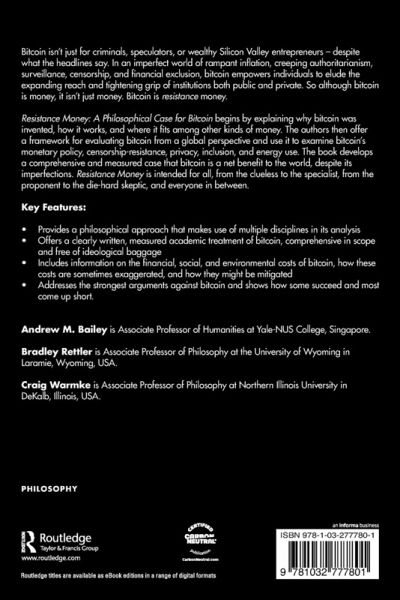 Resistance Money: A Philosophical Case for Bitcoin begins by explaining why bitcoin was invented, how it works, and where it fits among other kinds of money. The authors then offer a framework for evaluating bitcoin from a global perspective and use it to examine bitcoin's monetary policy, censorship-resistance, privacy, inclusion, and energy use. The book develops a comprehensive and measured case that bitcoin is a net benefit to the world, despite its imperfections. Resistance Money is intended for all, from the clueless to the specialist, from the proponent to the die-hard skeptic, and everyone in between.