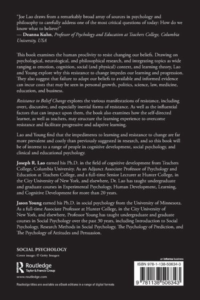 This book examines the human proclivity to resist changing our beliefs. Drawing on psychological, neurological, and philosophical research, and integrating topics as wide ranging as emotion, cognition, social (and physical) context, and learning theory, Lao and Young explore why this resistance to change impedes our learning and progression. They also suggest that failure to adapt our beliefs to available and informed evidence can incur costs that may be seen in personal growth, politics, science, law, medicine, education, and business. Resistance to Belief Change explores the various manifestations of resistance, including overt, discursive, and especially inertial forms of resistance. As well as the influential factors that can impact upon them, the book also examines how the self-directed learner, as well as teachers, may structure the learning experience to overcome resistance and facilitate progressive and adaptive learning. Lao and Young find that the impediments to learning and resistance to change are far more prevalent and costly than previously suggested in research, and so this book will be of interest to a range of people in cognitive development, social psychology, and clinical and educational psychology.