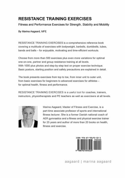 The most comprehensive compilation of resistance training exercises available. Over 500 exercises with bodyweight, dumbbells, barbells, tubes, bands and balls. For one-on-one, partner and group strength training at all levels, for novices, beginners, intermediate and advanced exercisers and Olympic athletes. With more than 1000 photos and step-by-step text on proper exercise technique. Basic posture, starting position and safety precautions are explained in detail. The book includes basic, intermediate and advanced exercises from top to toe, from inner unit to outer unit, for optimal health, fitness and performance - and enjoyable, time-efficient workouts. Including a comprehensive partner exercise section. 'Resistance Training Exercises', a Scandinavian bestseller, is a valuable reference book for any coach, trainer, physical exercise leader, personal trainer, fitness instructor, group exercise instructor, physiotherapist and PE teacher as well as exercisers at all levels.