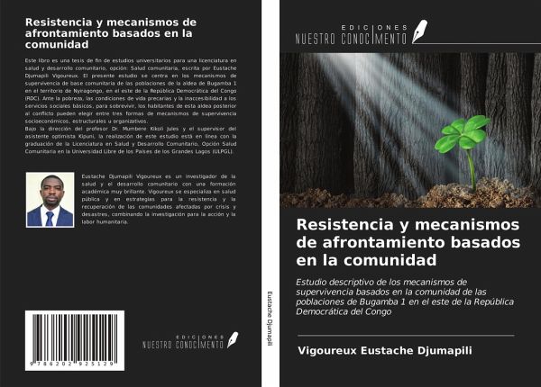 Este libro es una tesis de fin de estudios universitarios para una licenciatura en salud y desarrollo comunitario, opción: Salud comunitaria, escrita por Eustache Djumapili Vigoureux. El presente estudio se centra en los mecanismos de supervivencia de base comunitaria de las poblaciones de la aldea de Bugamba 1 en el territorio de Nyiragongo, en el este de la República Democrática del Congo (RDC). Ante la pobreza, las condiciones de vida precarias y la inaccesibilidad a los servicios sociales básicos, para sobrevivir, los habitantes de esta aldea posterior al conflicto pueden elegir entre tres formas de mecanismos de supervivencia socioeconómicos, estructurales u organizativos.Bajo la dirección del profesor Dr. Mumbere Kikoli Jules y el supervisor del asistente optimista Kipuni, la realización de este estudio está en línea con la graduación de la Licenciatura en Salud y Desarrollo Comunitario, Opción Salud Comunitaria en la Universidad Libre de los Países de los Grandes Lagos (ULPGL).