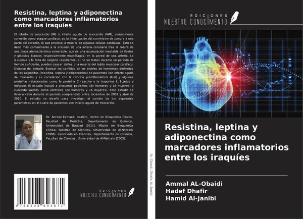 El infarto de miocardio (IM) o infarto agudo de miocardio (IAM), comúnmente conocido como ataque cardíaco, es la interrupción del suministro de sangre a una parte del corazón, lo que provoca la muerte de algunas células cardíacas. Esto se debe más comúnmente a la oclusión de una arteria coronaria tras la rotura de una placa aterosclerótica vulnerable, que es una acumulación inestable de lípidos y glóbulos blancos (especialmente macrófagos) en la pared de una arteria. La isquemia y la falta de oxígeno resultantes, si no se tratan durante un período de tiempo suficiente, pueden causar daños o la muerte del tejido muscular cardíaco. Objetivo del estudio: Evaluar los cambios en los niveles de hormonas derivadas de los adipocitos (resistina, leptina y adiponectina) en pacientes con infarto agudo de miocardio y su correlación con la citocina proinflamatoria (IL-6) y algunas proteínas relacionadas como la proteína C reactiva y la troponina I. Sujetos y métodos El estudio incluyó a cincuenta pacientes (34 hombres y 16 mujeres) y cuarenta sujetos como controles (24 hombres y 16 mujeres). Este estudio se llevó a cabo durante el período comprendido entre diciembre de 2009 y abril de 2010. El estudio se diseñó para investigar el cambio de los siguientes parámetros en el suero de pacientes con infarto agudo de miocardio.
