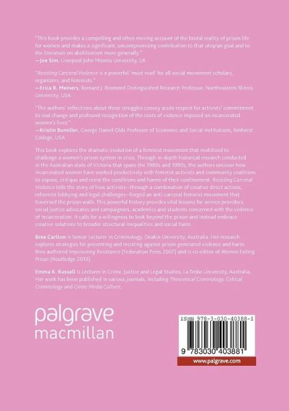 This book explores the dramatic evolution of a feminist movement that mobilised to challenge a women's prison system in crisis. Through in-depth historical research conducted in the Australian state of Victoria that spans the 1980s and 1990s, the authors uncover how incarcerated women have worked productively with feminist activists and community coalitions to expose, critique and resist the conditions and harms of their confinement. Resisting Carceral Violence tells the story of how activists-through a combination of creative direct actions, reformist lobbying and legal challenges-forged an anti-carceral feminist movement that traversed the prison walls. This powerful history provides vital lessons for service providers, social justice advocates and campaigners, academics and students concerned with the violence of incarceration. It calls for a willingness to look beyond the prison and instead embrace creative solutions to broader structural inequalities and social harm.