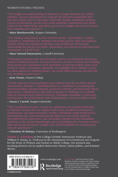 Political participation in America-supposedly the world's strongest democracy-is startlingly low, and many of the civil rights and economic equity initiatives that were instituted in the 1960s and '70s have been abandoned, as significant proportions of the populace seem to believe that the civil rights battle has been won. However, rates of collective engagement, like community activism, are surprisingly high. In Resisting Citizenship, renowned feminist political scientist Martha Ackelsberg argues that community activism may hold important clues to reviving democracy in this time of growing bureaucratization and inequality. This book brings together many of Ackelsberg's writings over the past 25 years, combining her own field work and interviews with cutting edge research and theory on democracy and activism. She explores these efforts in order to draw lessons-and attempt to incorporate knowledge-about current notions of democracy from those who engage in "non-traditional" participation, those who have, in many respects, been relegated to the margins of political life in the United States.