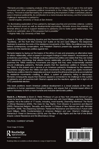 David A. J. Richards's Resisting Injustice and The Feminist Ethics of Care in The Age of Obama: "Suddenly,...All The Truth Was Coming Out" examines the roots of the resistance movements of the 1960s, the political psychology behind contemporary conservatism, and President Obama's present-day appeal as well as the reasons for the reactionary politics against him. This book positions recent American political development in a broad analysis of the role of patriarchy in human oppression throughout history, and argues that a feminist-based ethics of care is necessary to form a more humane and inclusive democratic politics.