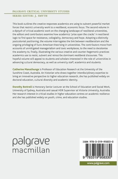 This book outlines the creative responses academics are using to subvert powerful market forces that restrict university work to a neoliberal, economic focus. The second volume in a diptych of critical academic work on the changing landscape of neoliberal universities, the editors and contributors examine how academics 'prise open the cracks' in neoliberal logic to find space for resistance, collegiality, democracy and hope. Adopting a distinctly postcolonial positioning, the volume interrogates the link between neoliberalism and the ongoing privileging of Euro-American theorising in universities. The contributors move from accounts of unmitigated managerialism and toxic workplaces, to the need to decolonise the academy to, finally, illustrating the various creative and counter-hegemonic practices academics use to resist, subvert and reinscribe dominant neoliberal discourses. This hopeful volume will appeal to students and scholars interested in the role of universities in advancing cultural democracy, as well as university staff, academics and students.