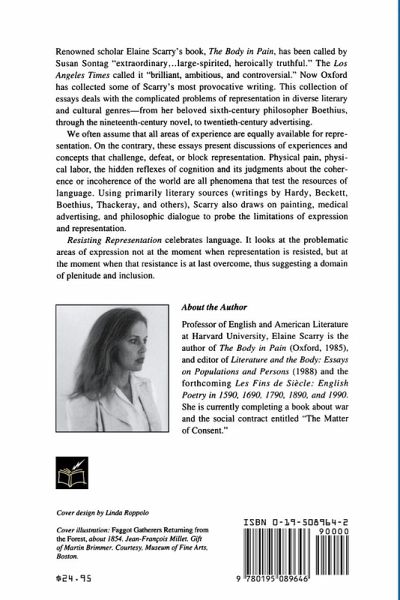 Resisting Representation brings together some of the most provocative essays by leading scholar Elaine Scarry. Through her readings of texts by Hardy, Beckett, Boethius, Thackeray, and others, Scarry examines the ability of language to accommodate conceptions of truth and cognition and also analyses phenomena such as physical pain and physical labour whose materiality might exclude them form reflexes of language.