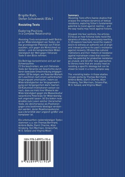 Resisting Texts versammelt zwölf Beiträge zur Widerständigkeit von Texten, die das grundlegende Potenzial von Fiktion ausloten, sich gegen die Wirklichkeit zu stellen und die komplementäre Widerständigkeit der Welt gegen fiktionale Texte in den Blick nehmen. Die Beiträge konzentrieren sich auf vier Schwerpunkte: (1) Sie beschreiben, wie sich fiktionale Texte der Dynamik von Geschichte durch deren bewusste Umschreibung entgegensetzen. (2) Sie zeigen, wie Texte den Wunsch der LeserInnen nach einem authentischen Ursprungsakt unterlaufen, indem sie Widerständigkeiten der Vergegenwärtigung von Vergangenheit stark machen. (3) Kulturellen Institutionen weisen sie nach, dass sie trotz ihrer Rhetorik der Widerständigkeit gegen die Massenkultur wesentliche Potenziale für Widerständigkeit ungenutzt lassen. (4) Sie bieten neue Ansätze zum Lesen solcher literarischer Texte, die üblicherweise als Positionen gegen eine bestimmte Ideologie verstanden werden, deren Reaktionspotenzial qua Literarizität aber ungleich größer und komplexer ist. Die untersuchten "widerständigen Texte" stammen u.a. von Thomas Bernhard, António Botto, Daniil Charms, Allen Ginsberg, Toni Morrison, Octavio Paz, W.G. Sebald und Virginia Woolf