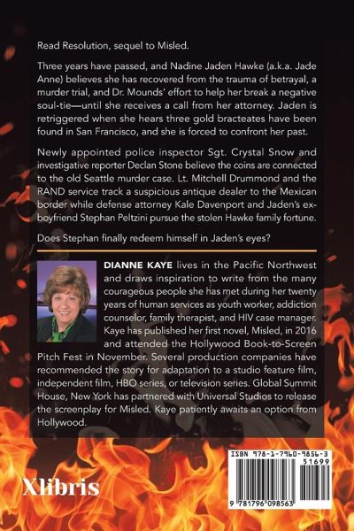 Read Resolution, sequel to Misled. Three years have passed, and Nadine Jaden Hawke (a.k.a. Jade Anne) believes she has recovered from the trauma of betrayal, a murder trial, and Dr. Mounds' effort to help her break a negative soul-tie-until she receives a call from her attorney. Jaden is retriggered when she hears three gold bracteates have been found in San Francisco, and she is forced to confront her past. Newly appointed police inspector Sgt. Crystal Snow and investigative reporter Declan Stone believe the coins are connected to the old Seattle murder case. Lt. Mitchell Drummond and the RAND service track a suspicious antique dealer to the Mexican border while defense attorney Kale Davenport and Jaden's ex-boyfriend Stephan Peltzini pursue the stolen Hawke family fortune. Does Stephan finally redeem himself in Jaden's eyes?