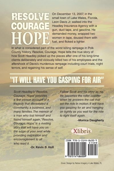 " On December 13, 2007, in the small town of Lake Wales, Florida, Leon Davis Jr. walked into an insurance agency with a gun, duct tape, and gasoline. He demanded money, wrapped two women in tape, doused them with fuel, and flicked a lighter. In what is considered part of the worst killing rampage in Polk County history, Resolve, Courage, Hope tells the true story of how Scott Headley picked up the pieces after a longtime client deliberately and viciously killed two of his employees, the aftershock of Davis's murderous rampage, court trials, night terrors, and regaining his sense of self. "