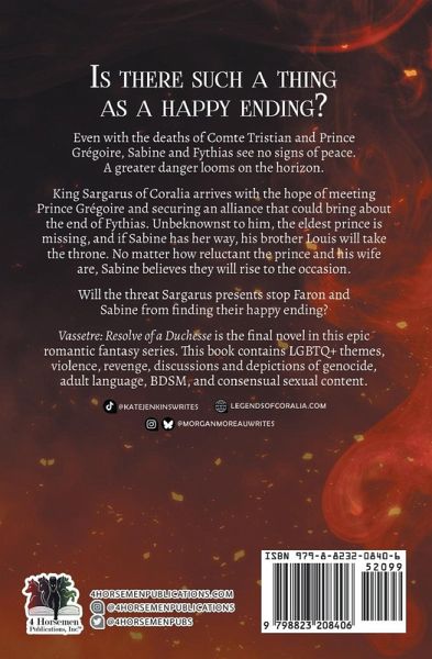 Is there such a thing as a happy ending? Even with the deaths of Comte Tristian and Prince Grégoire, Sabine and Fythias see no signs of peace. A greater danger looms on the horizon. King Sargarus of Coralia arrives with the hope of meeting Prince Grégoire and securing an alliance that could bring about the end of Fythias. Unbeknownst to him, the eldest prince is missing, and if Sabine has her way, his brother Louis will take the throne. No matter how reluctant the prince and his wife are, Sabine believes they will rise to the occasion. Will the threat Sargarus presents stop Faron and Sabine from finding their happy ending? Vassetre: Resolve of a Duchesse is the final novel in this epic romantic fantasy series. This book contains LGBTQ+ themes, violence, revenge, discussions and depictions of genocide, adult language, BDSM, and consensual sexual content.