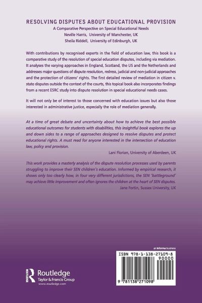 With contributions by recognised experts in the field of education law, this book is a comparative study of the resolution of special education disputes, including via mediation. It analyses the varying approaches in England, Scotland, the US and the Netherlands and addresses major questions of dispute resolution, redress, judicial and non-judicial approaches and the protection of citizens' rights. The first review of mediation in citizen v. state disputes outside the context of the courts, this topical book also incorporates findings from a recent ESRC study into dispute resolution in special educational needs cases. It will not only be of interest to those concerned with education issues but also those interested in administrative justice, especially the role of mediation generally