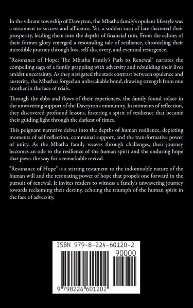 In the vibrant township of Daveyton, the Mbatha family's opulent lifestyle was a testament to success and affluence. Yet, a sudden turn of fate shattered their prosperity, leading them into the depths of financial ruin. From the echoes of their former glory emerged a resounding tale of resilience, chronicling their incredible journey through loss, self-discovery, and eventual resurgence. "Resonance of Hope: The Mbatha Family's Path to Renewal" narrates the compelling saga of a family grappling with adversity and rebuilding their lives amidst uncertainty. As they navigated the stark contrast between opulence and austerity, the Mbathas forged an unbreakable bond, drawing strength from one another in the face of trials. Through the ebbs and flows of their experiences, the family found solace in the unwavering support of the Daveyton community. In moments of reflection, they discovered profound lessons, fostering a spirit of resilience that became their guiding light through the darkest of times. This poignant narrative delves into the depths of human resilience, depicting moments of self-reflection, communal support, and the transformative power of unity. As the Mbatha family weaves through challenges, their journey becomes an ode to the resilience of the human spirit and the enduring hope that paves the way for a remarkable revival. "Resonance of Hope" is a stirring testament to the indomitable nature of the human will and the resonating power of hope that propels one forward in the pursuit of renewal. It invites readers to witness a family's unwavering journey towards reclaiming their destiny, echoing the triumph of the human spirit in the face of adversity.