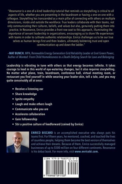 "Resonance is a one-of-a-kind leadership tutorial that reminds us storytelling is critical to all aspects of life, whether you are presenting in the boardroom or having a one-on-one with a colleague. Storytelling has transcended as a main pillar of connecting with others on multiple dimensions, inside and outside the workforce. True leaders collaborate with their teams, not only communicating their cultures, beliefs, and values but also, genuinely putting them into practice. In Resonance, Enrico provides a front-row seat to this approach, illuminating the importance of servant leadership in organizations, encouraging us to share life experiences with teams in order to cultivate authentic relationships. Enrico challenges us to be our true selves as human beings first and then leaders, ultimately bolstering trust and open communication up and down the ladder." --MAT BUNCH, MPA, Renewable Energy Generation Grid Reliability Leader at Enel Green Power, Author of Wanted: From Child Homelessness to a Death-Defying Search for Love and Belonging Leadership is vibrating in tune with others so that energy becomes infinite. It takes courage to lead in this world of eye-watering changes, but it also requires storytelling. No matter what plane, train, boardroom, conference hall, virtual meeting room, or restaurant you find yourself in while wearing your leader-skin, tell a tale, and you may quite conceivably all at once: · Receive a listening ear. · Share knowledge. · Ignite empathy. · Laugh and make others laugh. · Communicate who you are. · Accelerate collaboration. · Gain followership. · Stir a positive culture of feedforward (coined by Enrico). Enrico Biscaro is an accomplished executive who always puts his teams first. For fifteen years, he mentored, coached, and touched the lives of countless people, helping them become the best version of themselves and achieve their dreams. Because of them, Enrico successfully managed businesses of up to $500 million on four different continents. Resonance is his debut book. For more info, visit www.enricobi.com.
