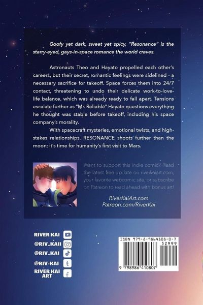 Goofy yet dark, sweet yet spicy, "Resonance" is the starry-eyed, gays-in-space romance the world craves. Astronauts Theo and Hayato propelled each other's careers, but their secret, romantic feelings were sidelined - a necessary sacrifice for takeoff. Space forces them into 24/7 contact, threatening to undo their delicate work-to-love-life balance, which was already ready to fall apart. Tensions escalate further as "Mr. Reliable" Hayato questions everything he thought was stable before takeoff, including his space company's morality. With spacecraft mysteries, emotional twists, and high-stakes relationships, RESONANCE shoots further than the moon; it's time for humanity's first visit to Mars. This edition has Adult-only content with an extended steamy scene and bonus steamy artwork.