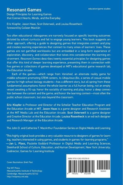 Principles for designing educational games that integrate content and play and create learning experiences connecting to many areas of learners' lives. Too often educational videogames are narrowly focused on specific learning outcomes dictated by school curricula and fail to engage young learners. This book suggests another approach, offering a guide to designing games that integrates content and play and creates learning experiences that connect to many areas of learners' lives. These games are not gamified workbooks but are embedded in a long-form experience of exploration, discovery, and collaboration that takes into consideration the learning environment. Resonant Games describes twenty essential principles for designing games that offer this kind of deeper learning experience, presenting them in connection with five games or collections of games developed at MIT's educational game research lab, the Education Arcade. Each of the games--which range from Vanished, an alternate reality game for middle schoolers promoting STEM careers, to Ubiquitous Bio, a series of casual mobile games for high school biology students--has a different story, but all spring from these fundamental assumptions: honor the whole learner, as a full human being, not an empty vessel awaiting a fill-up; honor the sociality of learning and play; honor a deep connection between the content and the game; and honor the learning context--most often the public school classroom, but also beyond the classroom. The open access edition of this book was made possible by generous funding from the MIT Libraries and Klopfer's lab.