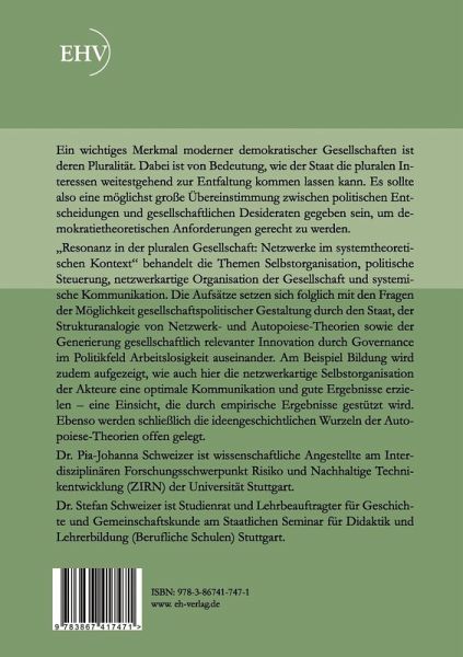 Ein wichtiges Merkmal moderner demokratischer Gesellschaften ist deren Pluralität. Dabei ist von Bedeutung, wie der Staat die pluralen Interessen weitestgehend zur Entfaltung kommen lassen kann. Es sollte also eine möglichst große Übereinstimmung zwischen politischen Entscheidungen und gesellschaftlichen Desideraten gegeben sein, um demokratietheoretischen Anforderungen gerecht zu werden. Resonanz in der pluralen Gesellschaft: Netzwerke im systemtheoretischen Kontext behandelt die Themen Selbstorganisation, politische Steuerung, netzwerkartige Organisation der Gesellschaft und systemische Kommunikation. Die Aufsätze setzen sich folglich mit den Fragen der Möglichkeit gesellschaftspolitischer Gestaltung durch den Staat, der Strukturanalogie von Netzwerk- und Autopoiese-Theorien sowie der Generierung gesellschaftlich relevanter Innovation durch Governance im Politikfeld Arbeitslosigkeit auseinander. Am Beispiel Bildung wird zudem aufgezeigt, wie auch hier die netzwerkartige Selbstorganisation der Akteure eine optimale Kommunikation und gute Ergebnisse erzielen eine Einsicht, die durch empirische Ergebnisse gestützt wird. Ebenso werden schließlich die ideengeschichtlichen Wurzeln der Autopoiese-Theorien offen gelegt. Dr. Pia-Johanna Schweizer ist wissenschaftliche Angestellte am Interdisziplinären Forschungsschwerpunkt Risiko und Nachhaltige Technikentwicklung (ZIRN) der Universität Stuttgart. Dr. Stefan Schweizer ist Studienrat und Lehrbeauftragter für Geschichte und Gemeinschaftskunde am Staatlichen Seminar für Didaktik und Lehrerbildung (Berufliche Schulen) Stuttgart.