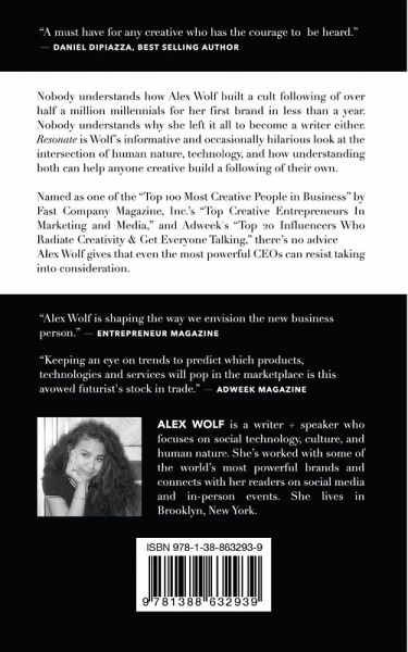 Nobody understands how Alex Wolf built a cult following of over half a million millennials for her first brand in less than a year. Nobody understands why she left it all to become a writer either. RESONATE is Wolf's informative and occasionally hilarious look at the intersection of human nature, technology, and how understanding both can help anyone creative build a following of their own. Named as one of the "Top 100 Most Creative People in Business" by Fast Company Magazine, Inc.'s "Top Creative Entrepreneurs In Marketing and Media," and Adweek's "Top 20 Influencers Who Radiate Creativity & Get Everyone Talking," there's no advice Alex Wolf gives that even the most powerful CEOs can resist taking into consideration. "Alex Wolf is shaping the way we envision the new business person." - Entrepreneur Magazine "Keeping an eye on trends to predict which products, technologies and services will pop in the marketplace is this avowed futurist's stock in trade." - Adweek Magazine "A must have for any creative who has the courage to be heard." - Daniel DiPiazza, Best Selling Author