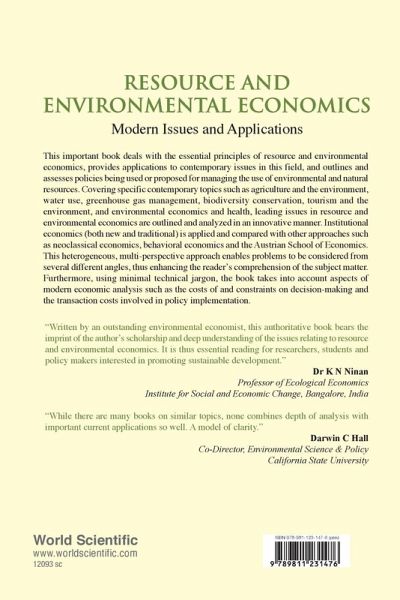 This important book deals with the essential principles of resource and environmental economics, provides applications to contemporary issues in this field, and outlines and assesses policies being used or proposed for managing the use of environmental and natural resources. Covering specific contemporary topics such as agriculture and the environment, water use, greenhouse gas management, biodiversity conservation, tourism and the environment, and environmental economics and health, leading issues in resource and environmental economics are outlined and analyzed in an innovative manner. Institutional economics (both new and traditional) is applied and compared with other approaches such as neoclassical economics, behavioral economics and the Austrian School of Economics. This heterogeneous, multi-perspective approach enables problems to be considered from several different angles, thus enhancing the reader's comprehension of the subject matter. Furthermore, using minimal technical jargon, the book takes into account aspects of modern economic analysis such as the costs of and constraints on decision-making and the transaction costs involved in policy implementation.