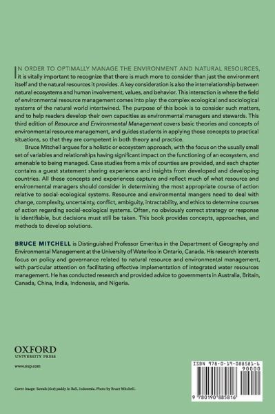 In order to optimally manage the environment and natural resources, it is vitally important to recognize that there is much more to consider than just the environment itself and the natural resources it provides. A key consideration is also the interrelationship between natural ecosystems and human involvement and behavior. This interaction is where the field of environmental resource management comes into play: the complex ecological and sociological systems of the natural world intertwined. The purpose of this book is to consider such matters, and to help readers develop their own capacities as environmental managers and stewards. Bruce Mitchell's textbook Resource and Environmental Management served as the gold standard for many environmental science courses when the first edition published in 1997. Now, twenty years later, an updated third edition allows for the inclusion of recent developments. The book covers the basic theories and concepts of environmental resource management, and guides students to be able to apply those concepts to practical situations. By covering basic theories and concepts, and by using case studies to show how these have been applied, Bruce Mitchell's new edition seeks to ensure that students have competence in both aspects. The text enhances the reader's capacity to conduct practice and research in resource and environmental management.